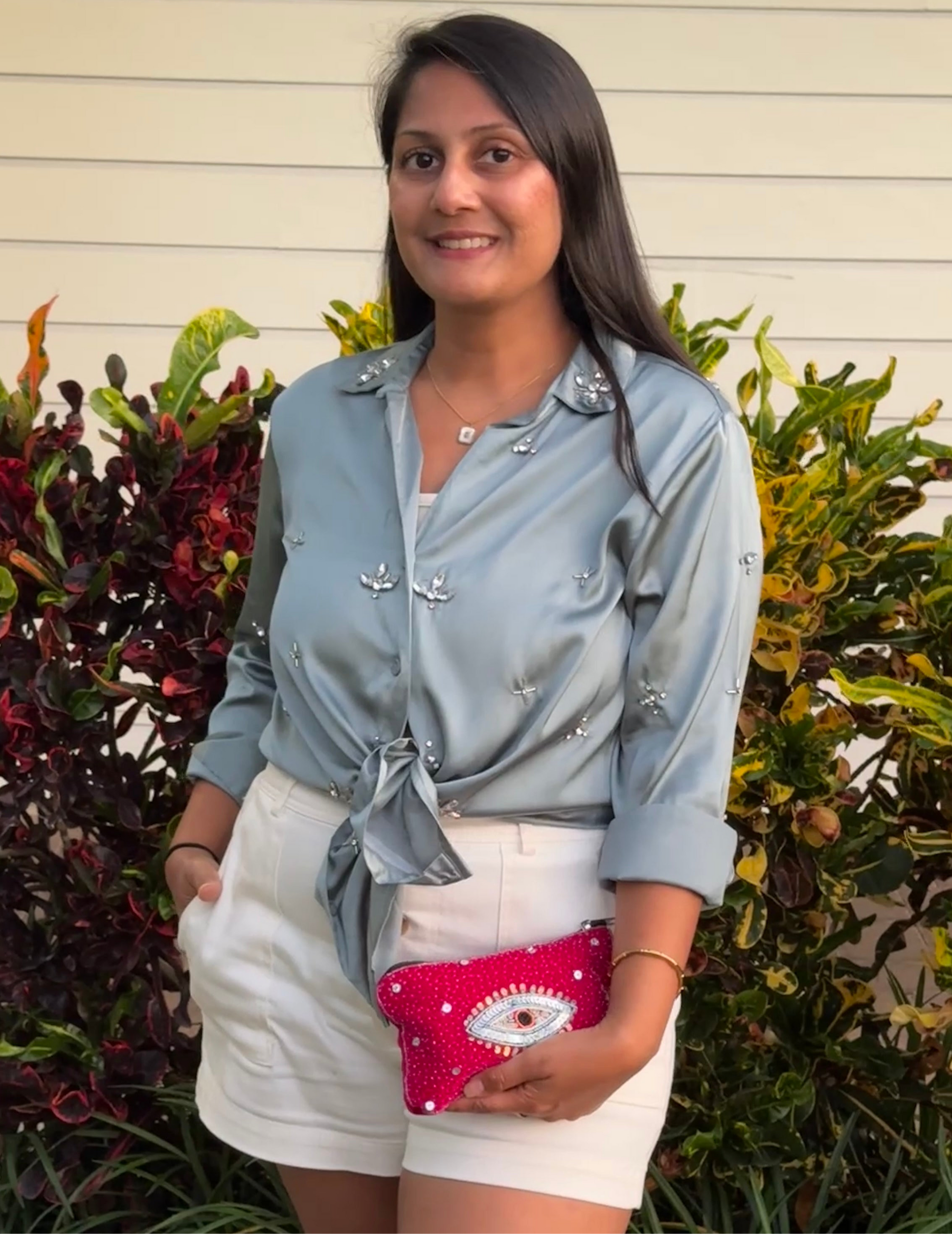 Our Evil Eye Pouch is handcrafted with intricate bead work and sequins on a super soft velvet material.