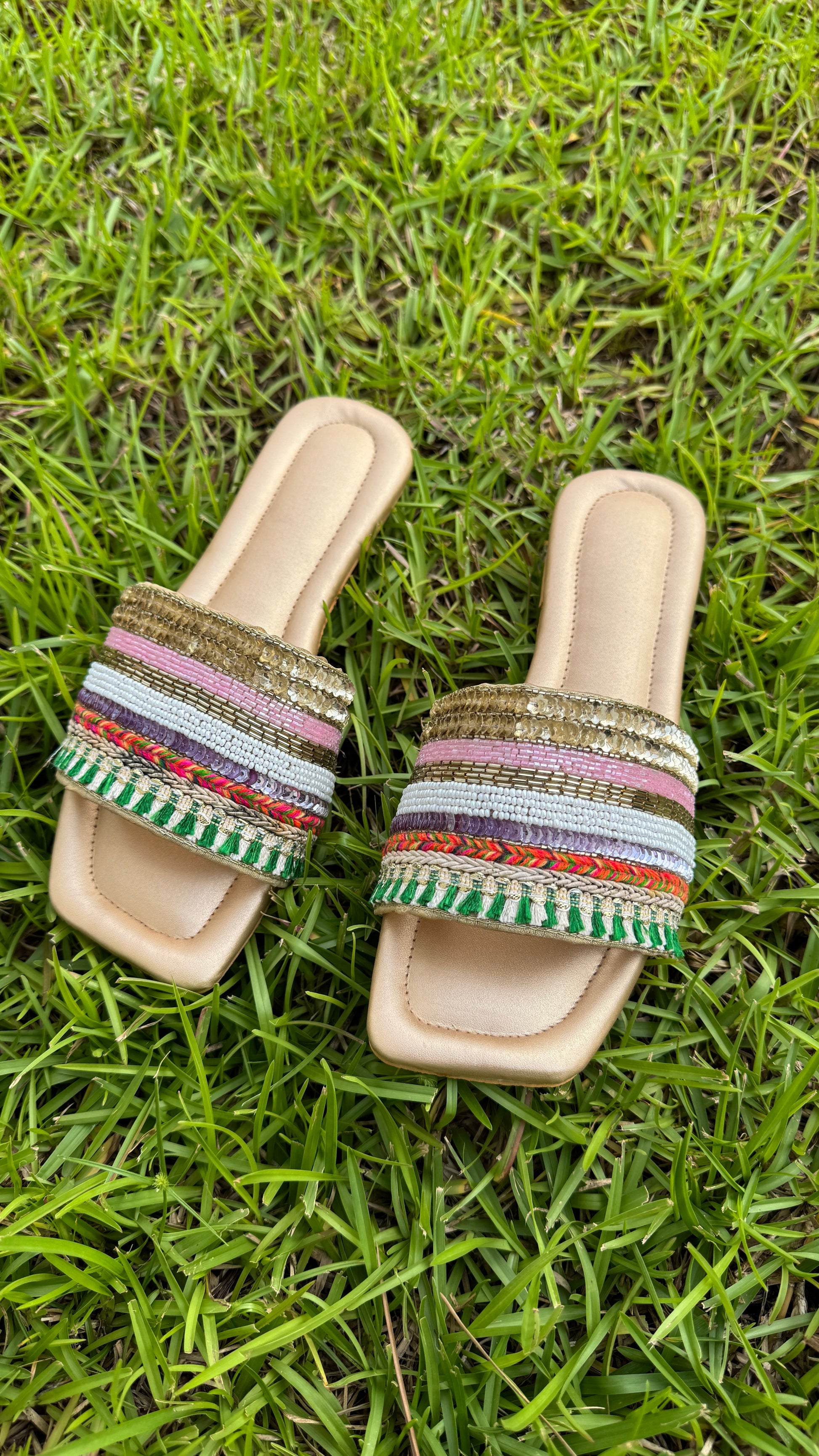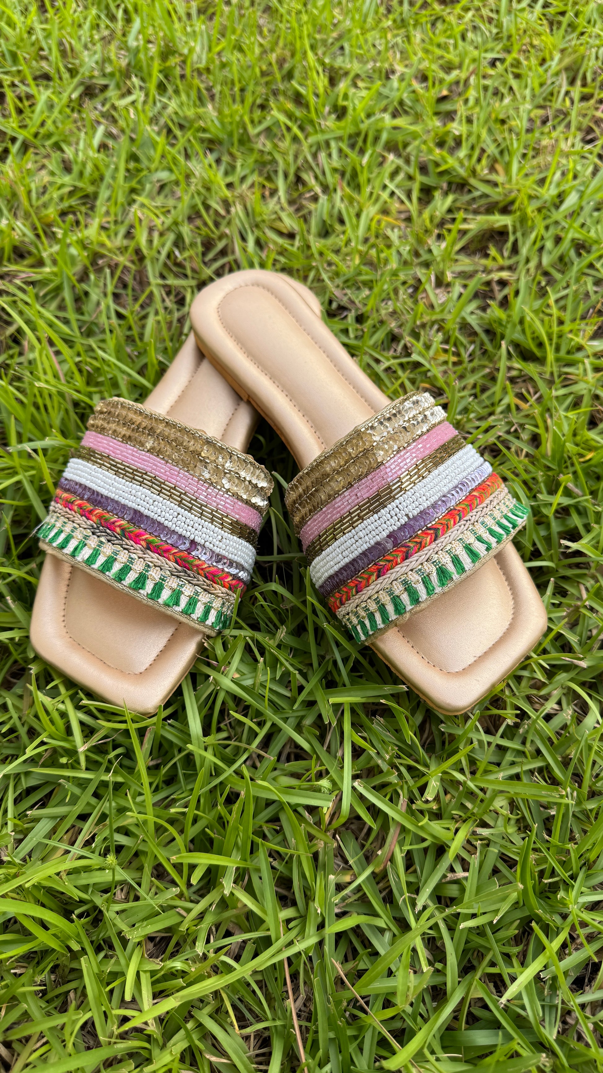 Handcrafted bead and sequence work sandals.
