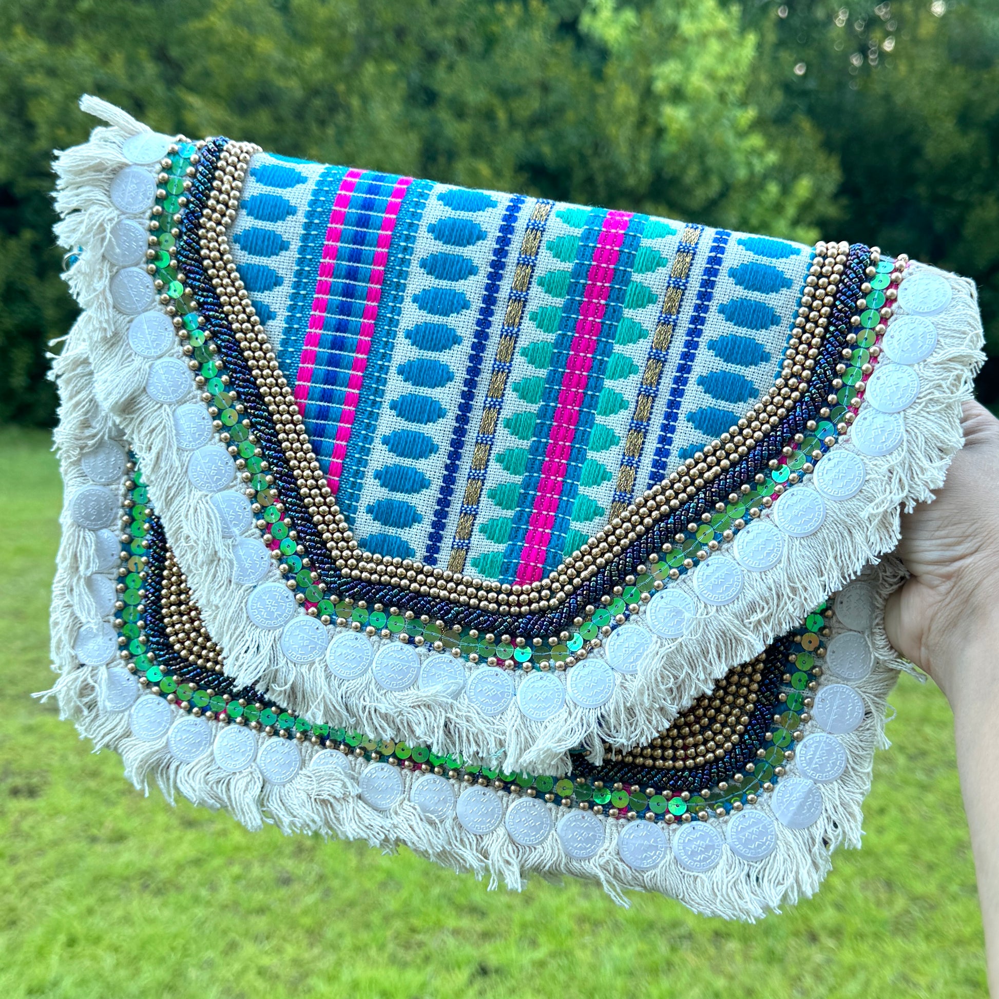 Each clutch is handcrafted with love and is unique to itself. Our Tribal Clutches close with a zipper and magnetic clasp. It also has an internal zipper pocket with a detachable silver chain.