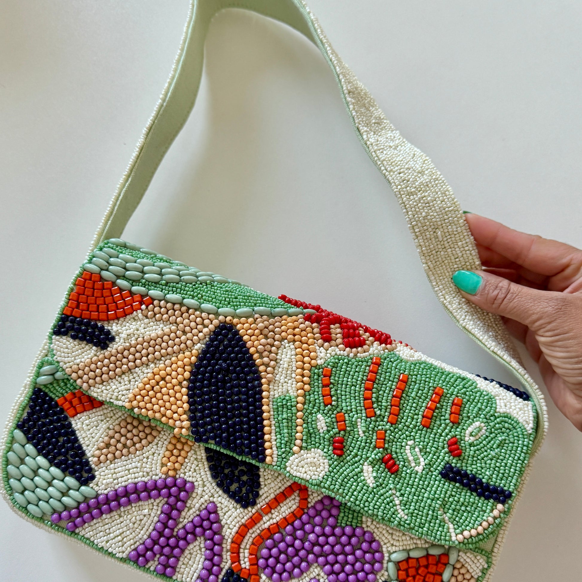 Handcrafted fully beaded shoulder bag with small pocket inside.